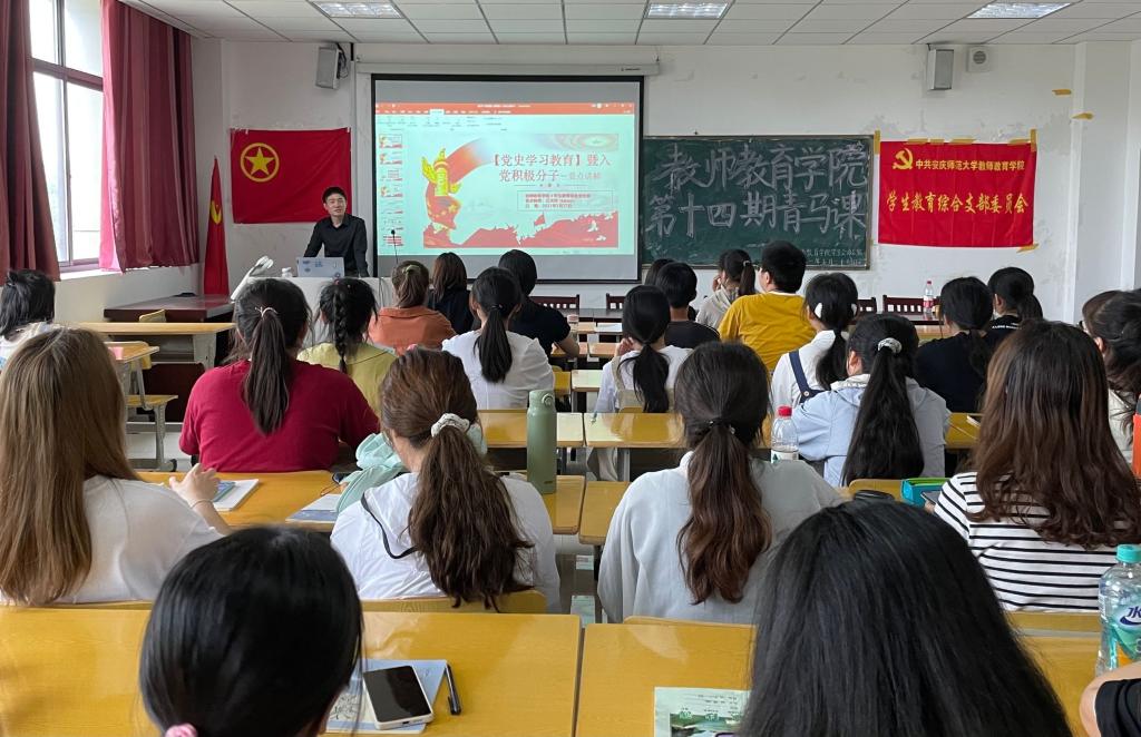 为全面学习贯彻落实习近平新时代中国特色社会主义思想,坚持理论联系实际,进一步加强入党积极分子对党的认识和对党的基本理论、路线、方针政策的认识,加强党史学习教育,5月27日中午,教师教育学院第十四期第三次青马课在j305开课,学生教育综合党支部书记汪洋洋进行宣讲,全体大一班委和学生会成员参加课程。
