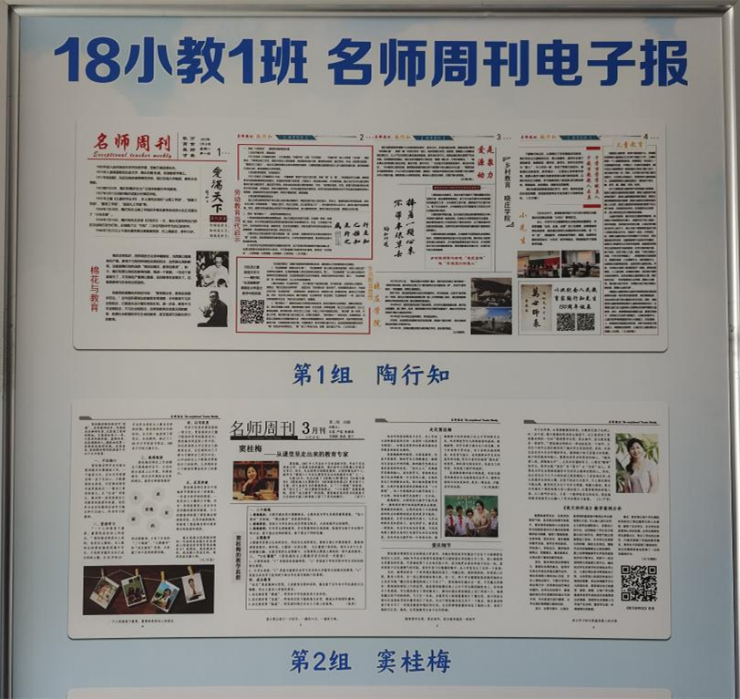 清华附小校长窦桂梅、全国教书育人楷模张桂梅、教育思想泰斗苏霍姆林斯基……近日,在教师教育学院大厅展出了16份由学生自制的有关教育名师的报纸,精美的排版与丰富的内容让路过学生忍不住驻足观看。