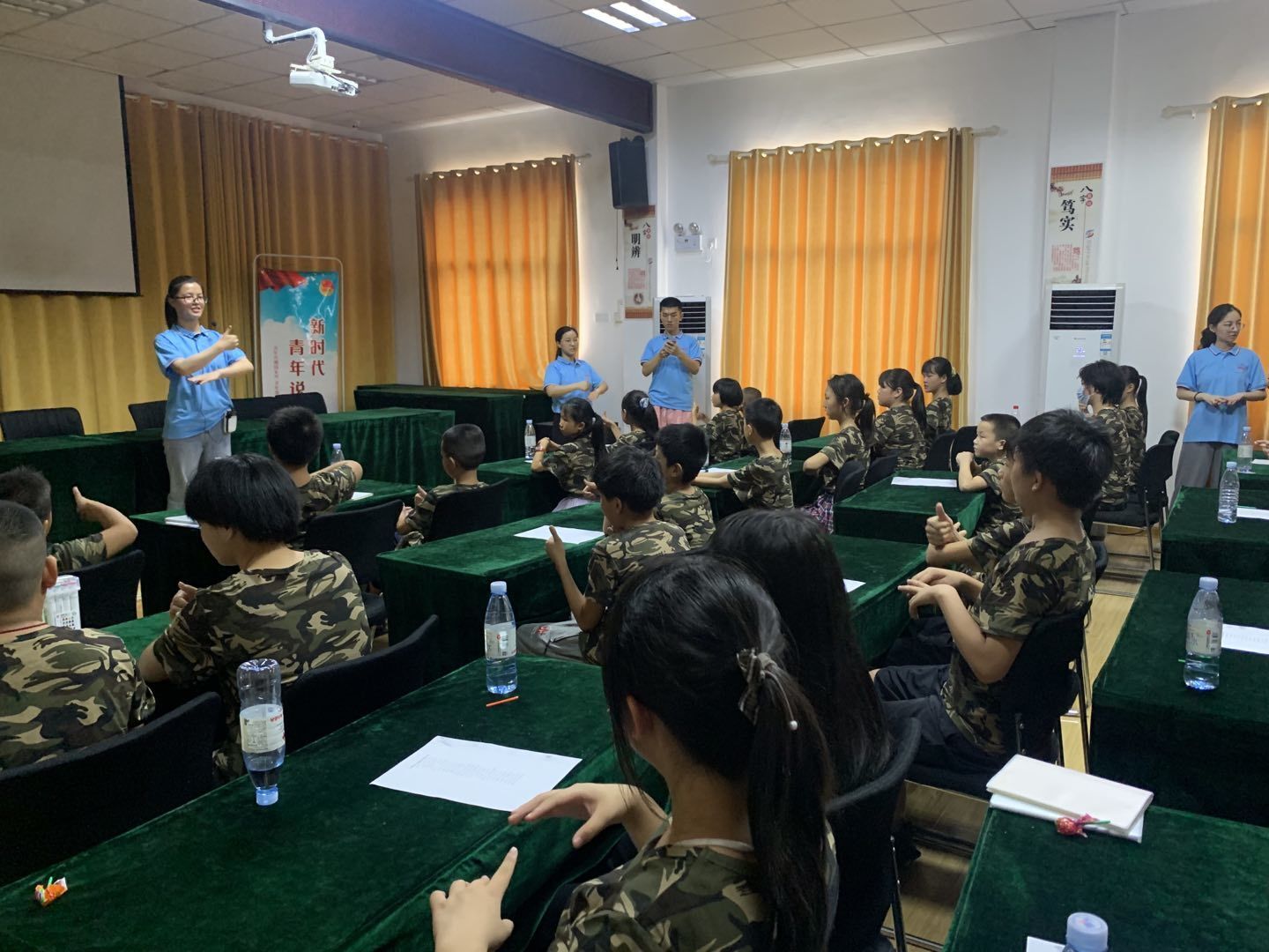 “没有共产党就没有新中国 ,没有共产党就没有新中国”,伴随着歌曲《没有共产党,就没有新中国》的播放,营员们在实践队员的带领下缓慢打出了歌词中的手语动作。“同学们将双手食、中指搭成‘共’字形,手背向上,右手向下碰三下左手,来表示共产党。”在队员们耐心且生动的讲解下,学生切身感受到手语这种肢体语言的独特魅力。随着教学的推进,课堂气氛逐渐活跃起来,同时旁听的部分学生家长也深受吸引,自发跟着练习手语。