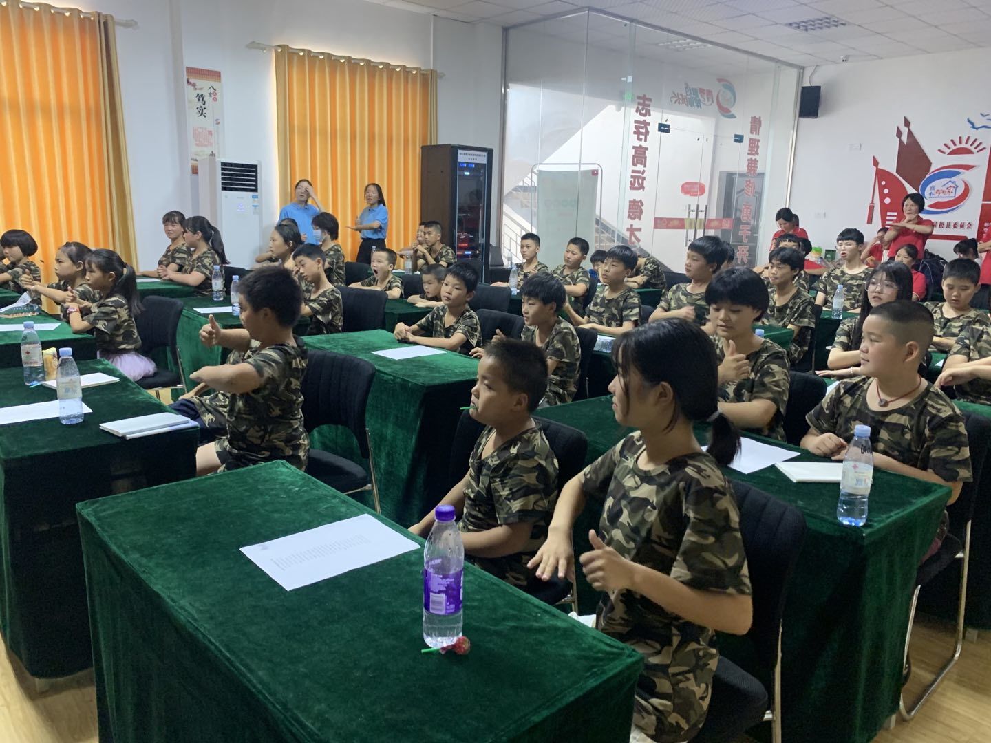 “没有共产党就没有新中国 ,没有共产党就没有新中国”,伴随着歌曲《没有共产党,就没有新中国》的播放,营员们在实践队员的带领下缓慢打出了歌词中的手语动作。“同学们将双手食、中指搭成‘共’字形,手背向上,右手向下碰三下左手,来表示共产党。”在队员们耐心且生动地讲解下,学生切身感受到手语这种肢体语言的独特魅力。
