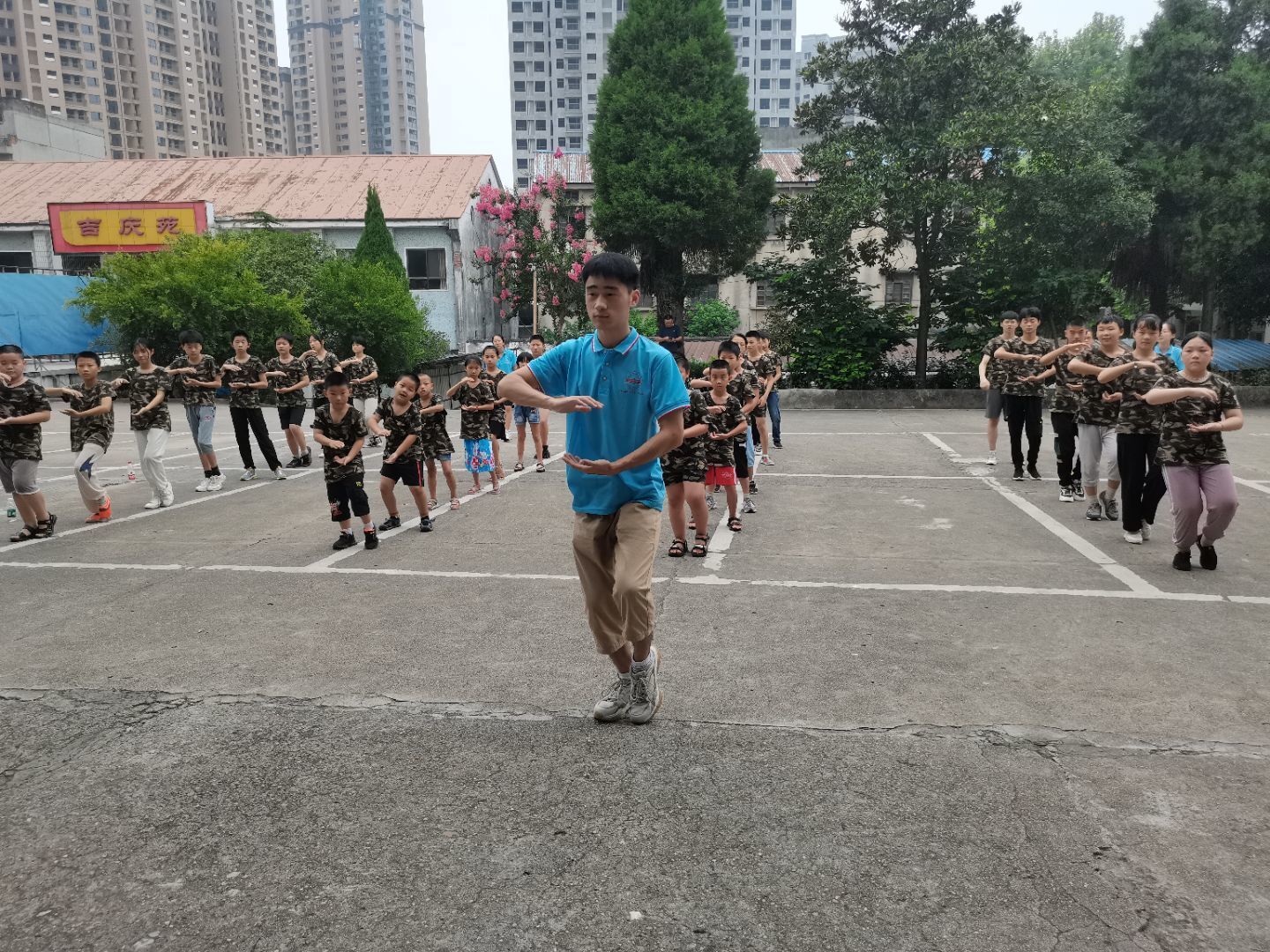 清晨,实践队员带领学生们完成热身动作后,就开始了太极拳的教学。“起势,首先两脚开立,两臂前举,接着屈膝按掌。注意在做动作时身体姿态要正,两肘自然沉下去,落臂屈膝须一致,按掌高度与腰齐平。”实践队员分步骤拆解动作,野马分鬃、白鹤亮翅、手挥琵琶……学生在实践队员的带领下,精神饱满,神情专注,一招一式,尽显流畅自然、内敛圆活的意蕴之美和刚柔相济的太极风范。