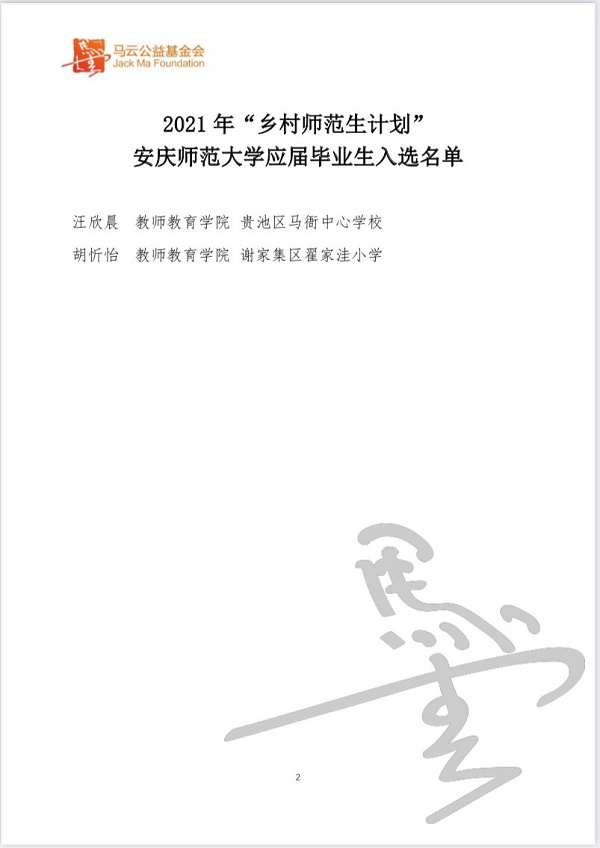 此次,我院共有2名同学成功入选“马云乡村师范生计划”。祝贺的同时,更希望越来越多的学子能在乡村教育领域深耕不缀,坚守三尺讲台,躬耕半亩方塘,以一颗赤子之心,壮大乡村教育力量!(撰稿:学生记者 吴雨轩 张志伟 刘宇晴 审核:许世平)
