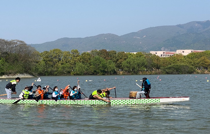 在整齐划一的呐喊声中,赛龙舟活动正式开始。同学们凭借着高度的默契和团结一致的心态挥桨,龙舟竞渡,奋勇向前。活动使同学们在收获了勇气和信心,充分享受到了龙舟运动的乐趣,同时,在这水天一色间,释放激情自我,在蓝天白云下,以舟和水为纽带,拉近了彼此的距离。