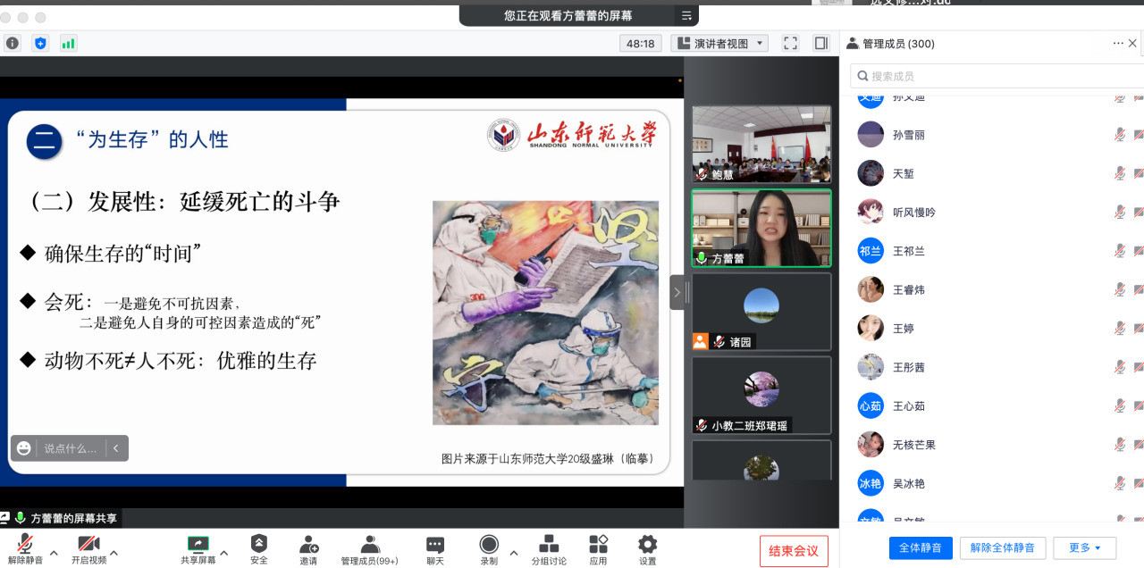 方蕾蕾博士做了题为《道德教育的使命:对人之依附性生存的超越》的报告,报告从“人需要关注生存,人为何关注生存”两大疑惑切入,从“为生存”的人性,“为依附”的生存和“为超越”的道德教育三个方面进行深入阐述,结合疫情时期的社会生存状况,提出要超越共生,寻求共存;超越自失,获得自主;超越逃避,勇于担当;超越权威,崇尚理性。