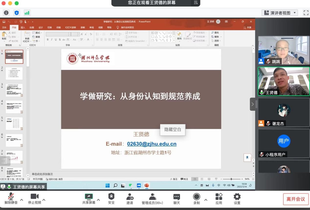 5月14日晚,初等教育系品牌学术活动“红色园丁大讲坛”开展了杰出校友系列讲座的第二讲,本次讲座邀请了我院优秀毕业生,湖州师范学院教师教育学院王贤德博士做了题为《学做研究:从身份认知到规范养成》的学术报告,报告由初等教育系主任诸园教授主持,小学教育专业近300名本科生和硕士研究生线上聆听了报告。