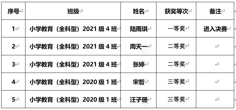 在刚刚结束的2022年全国大学生英语竞赛中,小学教育专业学生喜获佳绩,共有五位学生获得奖项,包括一等奖1名、二等奖与三等奖各2名。其中,小学教育(全科型)2021级4班的陆雨琪同学获得C类一等奖第一名,进入总决赛将角逐特等奖。
