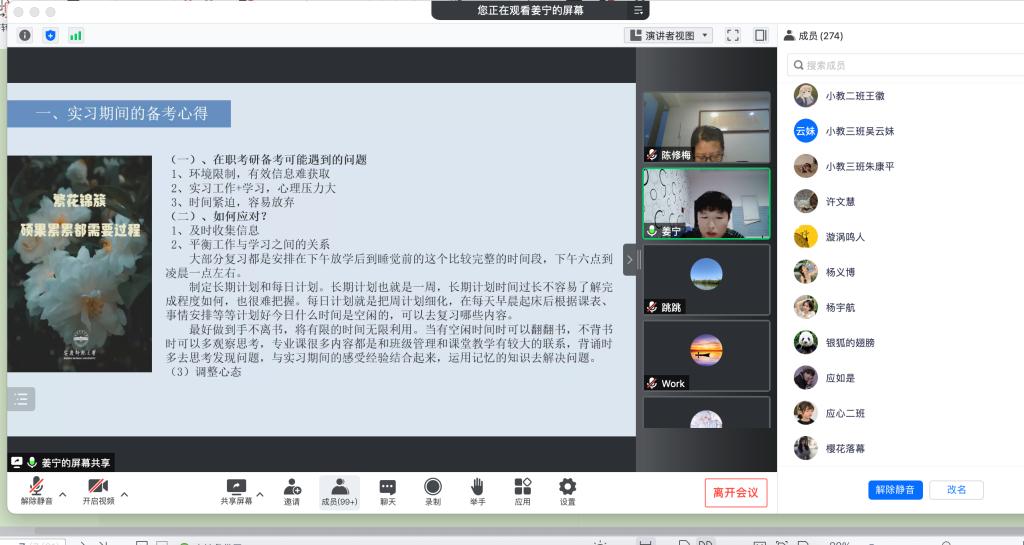 6月12日晚上,初等教育系品牌学术活动“红色园丁大讲坛”优秀校友系列讲座如期开讲,小学教育专业姜宁、甄慧瑾两位优秀校友应邀分享了各自的考研经验。本次线上会议由陈修梅老师主持,教师教育学院近300名本科生聆听了报告。