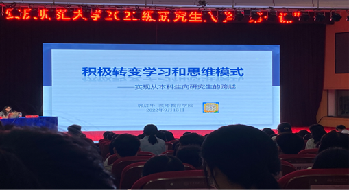 9月13日,2022级研究生入学第一课在图书馆东报告厅举行。我院郭启华教授受邀作为导师代表为2022级全体研究生做学习方法讲座。