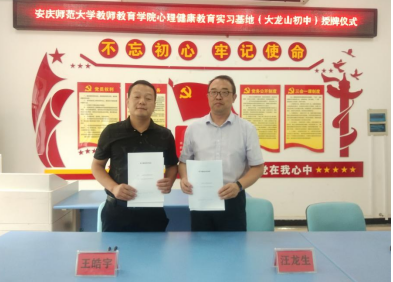 为提升人才培养质量,培养学生实践技能,持续不断为在校学生提供更高质量的实习实践机会,9月23日上午,我院与大龙山初级中学进行了实习基地签约仪式,建立实践教学基地共建关系。副院长王皓宇、大龙山初级中学校长汪龙生及指导教师江瑞辰博士等共同参加了仪式。