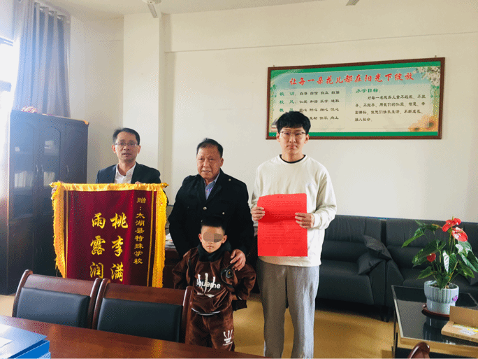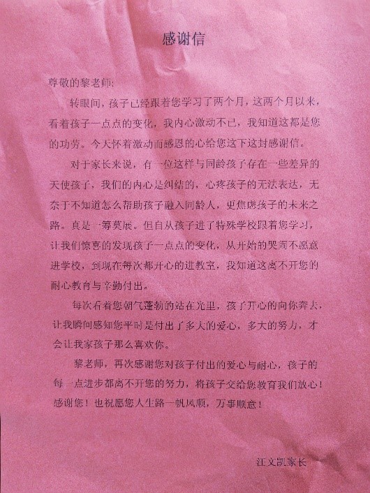 两个月以来,在黎浩同学悉心教导和贴心照顾下,孩子每天都在发生可喜的变化。从开始对学校的抵触和不情愿,变成了现在开心走进教室学习的模样,让家长内心无比欣喜。作为一名特殊教育专业的学生,黎浩用实际行动弘扬了特殊教育教师爱岗敬业、无私奉献的精神,一封感谢信,一面锦旗,是对黎浩同学实习工作最好的认可与表彰。