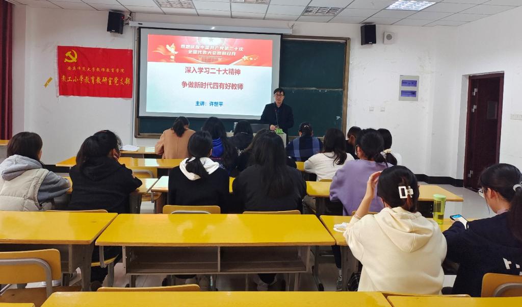 11月23日下午,学院副书记许世平在J305教室为小学教育教研室党支部上“深入学习二十大精神,争做新时代四有好教师”的专题党课,本次活动由支部书记诸园主持,支部全体教师党员和小学教育学生党支部党员到场聆听。