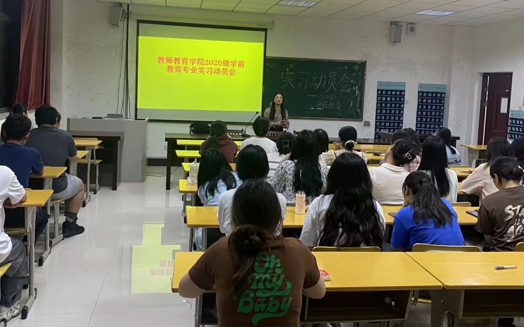 为积极引导2024届学前教育专业毕业生做好教育实习前的各项准备,推进教育实习工作的顺利开展,2023年9月25日晚,我院2020级学前教育实习生在J305教室召开教育实习动员大会。学前教育专业负责人高向东、墨子巷幼儿园园长杨俊梅及学前教育教研室教师谢红玉参与了本次实习动员大会。