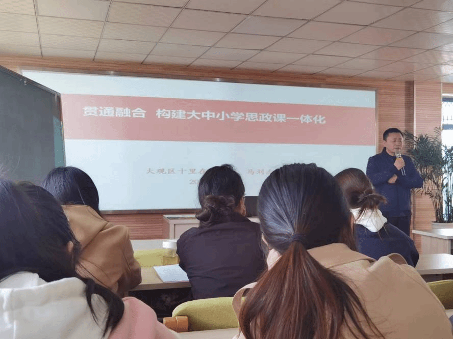 在十里中心学校,校长刘同明对安庆师大师生们的到来表示热烈欢迎,并对专业见习提出了要求。随后,同学们观摩了该校优秀教师展示的数学课堂和语文课堂,现场聆听了马刘杰副校长所作的“贯通融合、构建大中小学思政课一体化”的专题讲座。