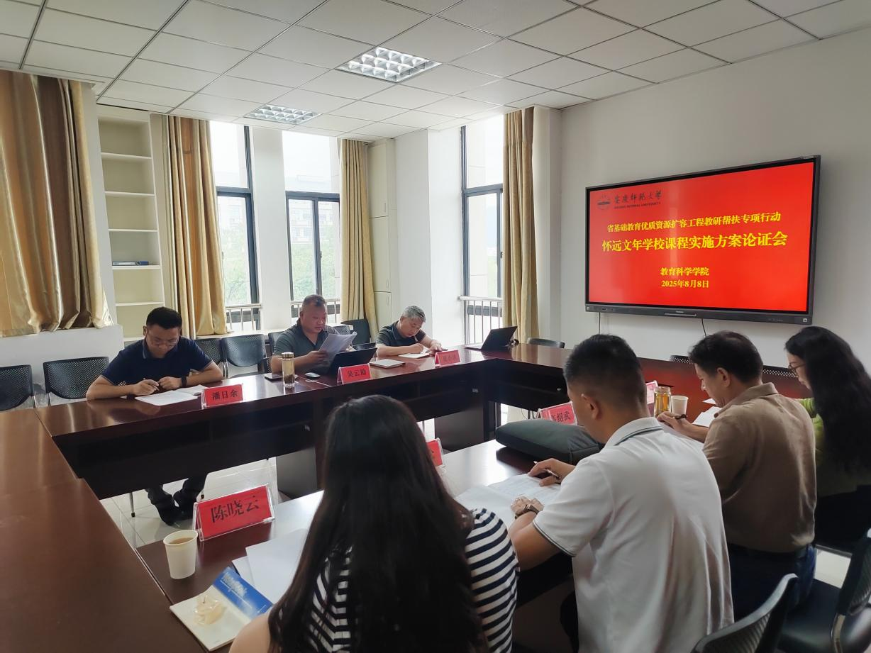 2025年8月8日,怀远文年学校执行校长高绍武、教研室主任陈松、办公室副主任张玉凤和语文教研组组长陈晓云一行四人来到学院,就该校即将实施的学科课程实施方案听取专家意见,学院在J202会议室举行了“怀远文年学校课程实施方案论证会”。会议由院长吴云助主持,我院部分教师参加了论证会。