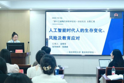 近日,“第十三届泛长三角地区教育学研究生陶行知学术论坛”在南京师范大学落下帷幕。我院24级研究生金晓雪与其导师张峰峰博士共同撰写的《人工智能时代人的生存变化、风险及教育应对》荣获三等奖,并在分论坛作主题分享。该研究围绕“人工智能如何重塑人的生存,教育又应如何引导人的发展”这一时代命题,从“生存新样态”“潜在风险”“教育应对”三大核心维度展开深入论述。