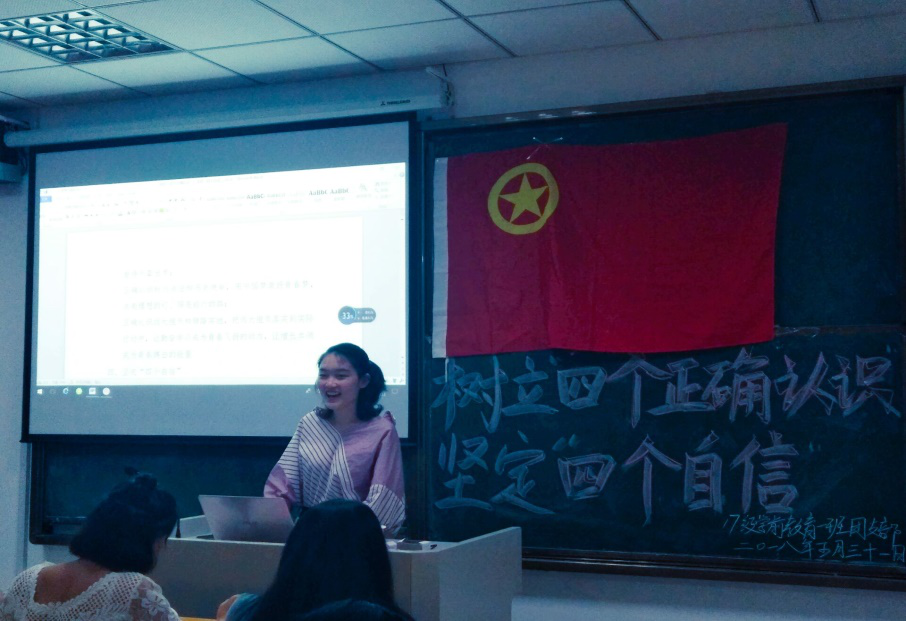 2018年5月31日晚,17级学前教育一班团支部积极响应党的号召,为进一步加强团的基层组织建设,团支书夏多媛组织开展了以树立“四个正确认识”,坚定“四个自信”为主题的团课学习活动,随后召开团支部大会进行深入讨论。最后,支部成员以“成才不负青云志,报国常怀赤子心”为演讲主题来开展相关团日活动。