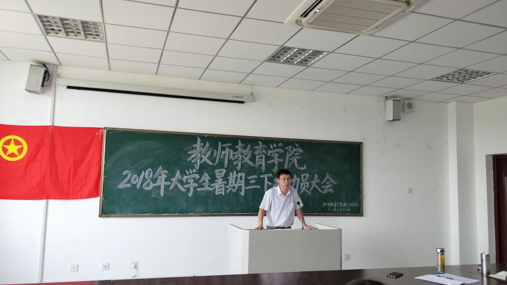 为积极贯彻学校第二课堂教学实践目标,做好2018年暑期“三下乡”社会实践活动,增强大学生参与社会实践活动的积极性,6月15日,由教师教育学院团总支学生会举办的教师教育学院2018年大学生暑期“三下乡”动员大会在J305教室成功举办。本次大会由团总支实践委员汪强主持,教师教育学院分党委副书记许世平老师、学生工作办公室主任唐凤霞老师和团总支书记严峻老师出席本次会议,教师教育学院团总支学生会全体成员以及各班级班长、团支书和组织委员参加了本次会议。