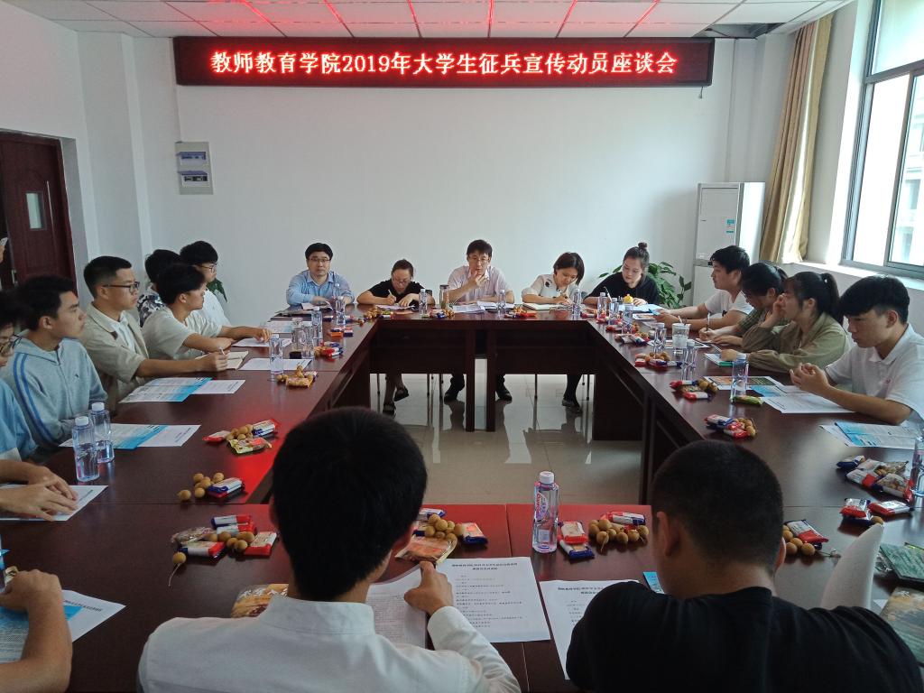 5月17日中午,教师教育学院开展大学生征兵宣传动员座谈会。学院党委副书记许世平、辅导员、退役复学同学代表及意愿参军同学代表20余人参加座谈会。许世平做动员讲话,他指出,第一当兵报国是践行五四精神的切实体现,五四精神的核心就是爱国主义,新时代青年需要勇于担当,树立远大理想。第二当兵入伍是实现习总书记关于强军梦思想的途径。一支强大的军队需要大量青年英才的加入,优秀学子需要积极投身军队国防建设。第三大学生入伍是磨炼品质、锤炼过硬本领,锻炼意志力的重要途径。他希望当代大学生珍惜机会,立志报国,为推进国防和军队现代化建设奉献青春,贡献力量。会上,学院征兵工作联系人对大学生征兵工作政策做宣传介绍,应邀参会退伍复学杨超分享了自身经历、收获以及感悟,参会同学进行了座谈咨询等。