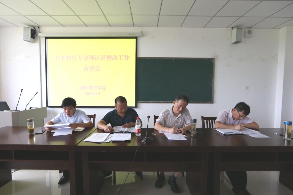 6月12日下午,教师教育学院召开小学教育专业预认证整改工作部署会。学院党委书记曹长德、院长吴云助、副书记许世平、副院长汪洋出席会议,小学教育专业全体教师、学院行政科室相关人员及辅导员参加了会议。会议由曹长德主持。
