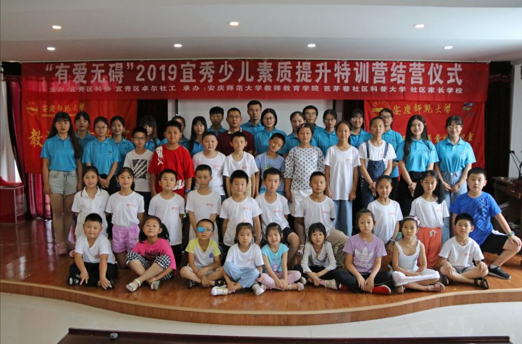 7月14日上午,经过为期七天的特训生活,“有爱无碍”2019年宜秀少儿素质提升特训营在安庆芭茅社区活动中心正式落下帷幕。宜秀区科协副主席李勇、伟德bv1946教师教育学院老师陈安定、芭茅巷社居委领导宣庆之、宜秀卓尔社工理事长王奎以及特训营的学生、家长、20名志愿者参加了此次结营仪式。