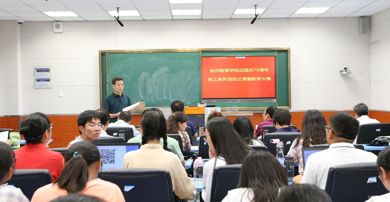 为喜迎国庆,深入贯彻全国教育大会和新时代全国高等学校本科教育工作会议精神,9月19日下午,教师教育学院迎国庆70周年教工系列活动之课堂教学大赛在J511举行,学院教学工作委员会成员及各教研室主任担任大赛评委。
