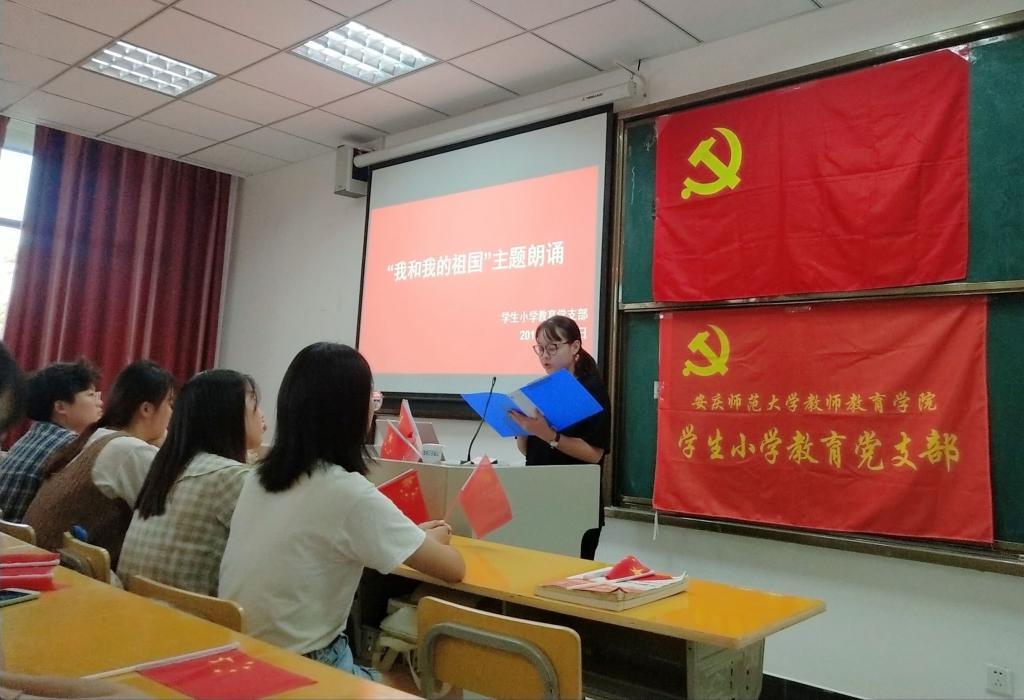 学生小学教育党支部开展“我和我的祖国”诗歌朗诵会。党员们通过朗诵《祖国啊,我亲爱的祖国》等脍炙人口的篇章抒发对祖国的歌颂和热爱,最后全体党员合唱《我和我的祖国》,为党和祖国献上最真切的祝福。