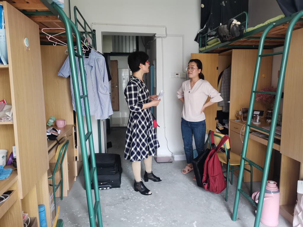 为掌握研究生返校后的生活状态,确保学生返校后疫情防控工作科学规范到位。5月15号中午,在我院党委副书记许世平的安排部署下,黄玉、姚强诚两位辅导员赴14号楼逐一走访返校研究生寝室。