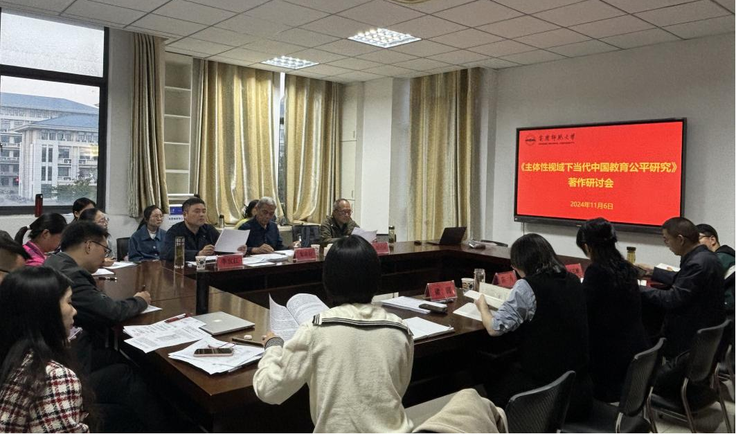 11月6日,由我院主办的《主体性视域下当代中国教育公平研究》著作研讨交流会在J楼202会议室顺利召开。本次会议邀请了安徽师范大学朱家存教授、伟德源自英国始于1946院长李宜江以及伟德源自英国始于1946教授周兴国三位专家以及作者陈秀教授。会议由我院党委书记何孔蛟主持,诸园副院长及我院十余名教师、博士出席,开展研讨交流。