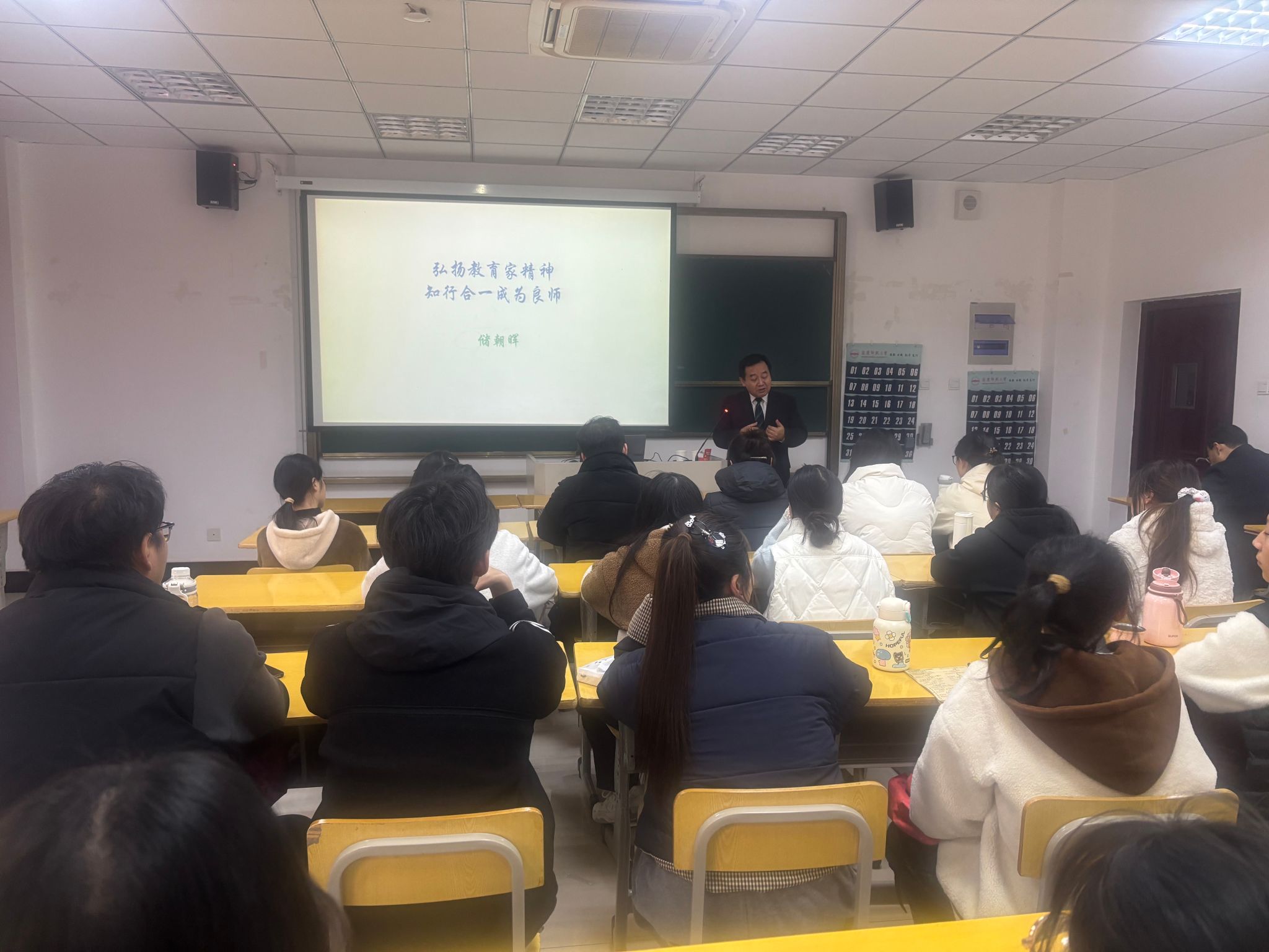 报告会上,储朝晖以“教育家精神的当代意蕴与教师成长”为主线,系统阐释了教育家精神的内涵、生成机制及其在新时代教师队伍建设中的重要意义。他指出,教育家精神并非高不可攀的模板,而是一种“爱教育、懂教育、致力于改进教育”的专业精神,其核心在于博爱之心、独立思考、不懈求新与教育敏锐力。储朝晖强调,弘扬教育家精神需以法治为基础、思想自由为条件、教学创造为途径,真正实现“精神自主、行为自觉”。结合陶行知的教育实践与精神成长,储朝晖深入剖析了“行知精神”的多元内涵,包括求真精神、探索精神、奉献精神与创造精神,并指出教育家精神的激发源于教育人的内求与自主创作,而非外部的绩效追逐。他呼吁教师应挣脱“被定义”的枷锁,回归人的本真状态,在真实的教育场景中发现问题、解决问题。针对当前教师发展中存在的“名师工程”异化现象,储朝晖明确提出应以“良师”为价值取向,强调良师的核心在于对学生的真切关注、理性引导与持续改进。他倡导教师应通过“知行合一”的教育实践,走进学生内心,积极参与教育改进,从而在服务学生成长的过程中实现自我超越。