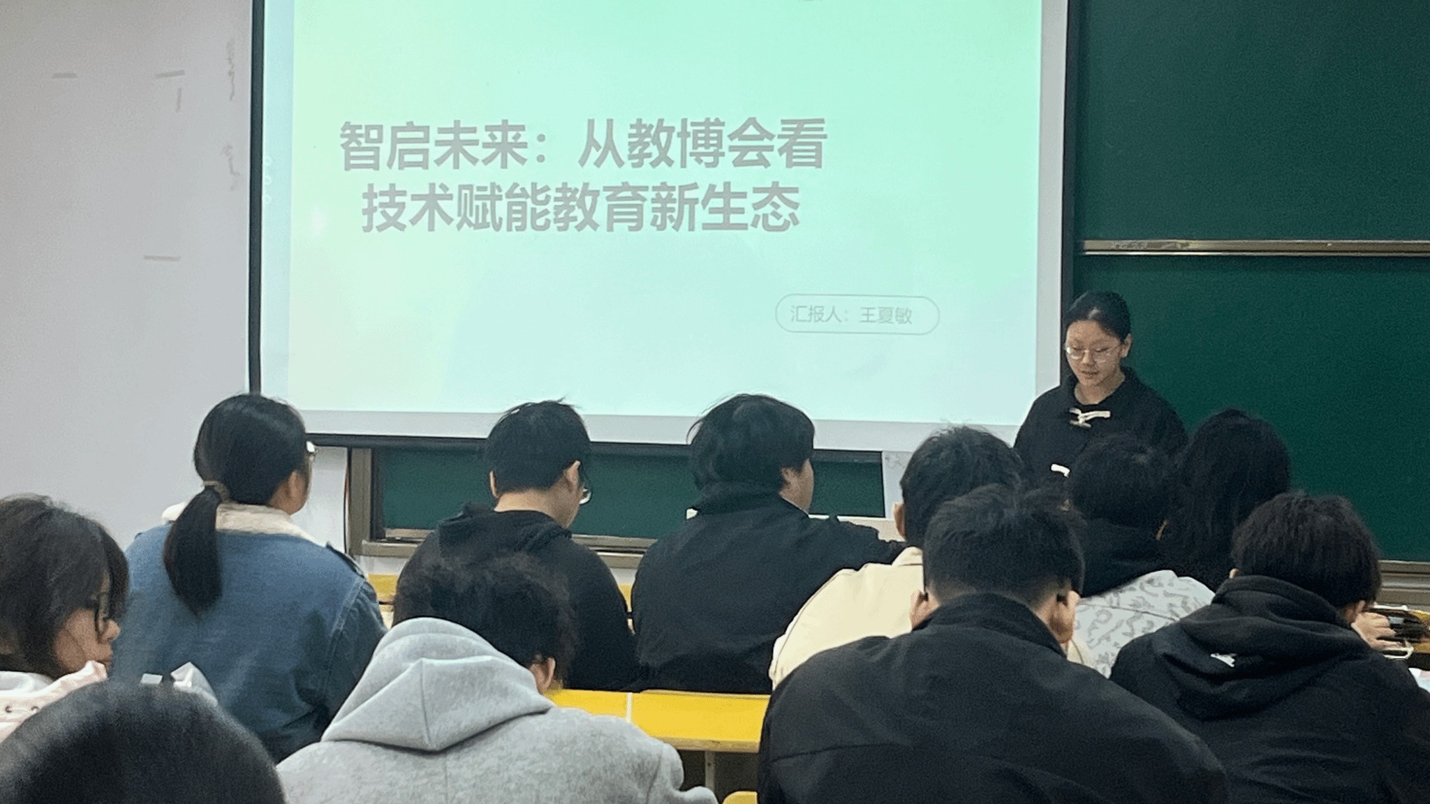 张雨轩以"从工具理性到生态重构:教育博览会视域下的数字化转型前沿"为题,在简单介绍教博会的基本情况、部分创新作品后,以四个趋势概括了当前创新作品发展现状,分别是AIGC(人工智能生成内容)从概念热潮走向课堂的深度融合、教学评价方式全面创新、教学模式迈向体系化和数字化、人工智能技术助力教育公平。最后,她结合参会经验和研究生学习经历,认为本科生应具备扎实的专业基础、创新思维和实践能力,永葆对教育的热爱和敬畏之心。