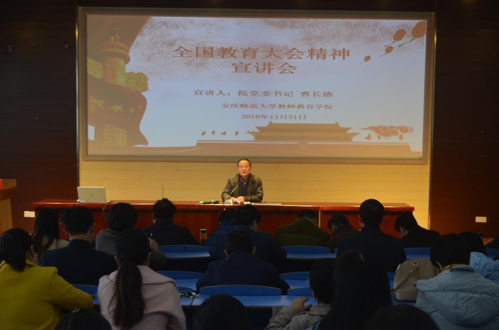 11月21日下午,教师教育学院召开学习贯彻全国教育大会精神宣讲报告会。本次报告会由教师教育学院党委书记曹长德主讲,教师教育学院全体教职工和学生党员参加。
