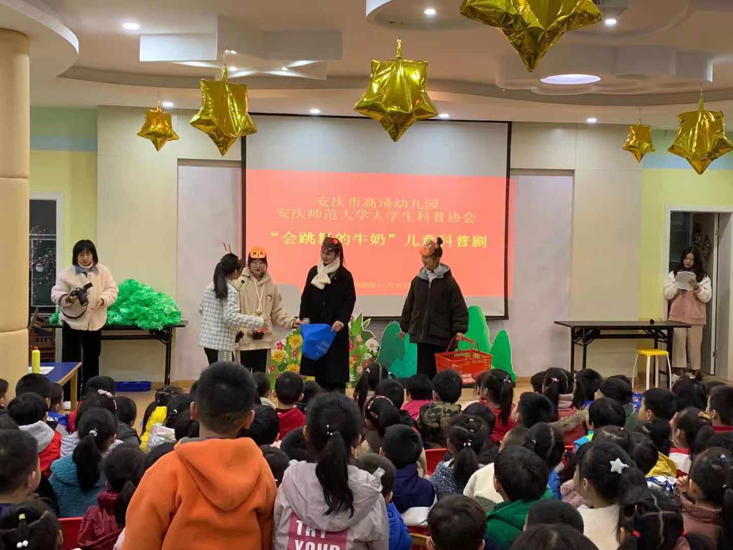 11月25日下午,教工学前教育教研室党支部指导大学生科普协会表演的《会跳舞的牛奶》儿童剧在安庆市高琦幼儿园开演。此次“奇幻科学小剧场”之“送剧到园”活动是学前教育教研室开展的大学生创新创业训练的重要成果,也是教工学前教育教研室党支部特色党日活动。
