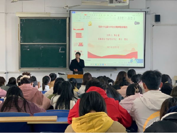 为深入学习党的十九届六中全会精神,增强入党积极分子对党的认识,提高政治素养,坚定入党信念,12月1日,学院党委书记陈志超在文溯楼208教室为第64期入党积极分子作“党的十九届六中全会精神”宣讲报告