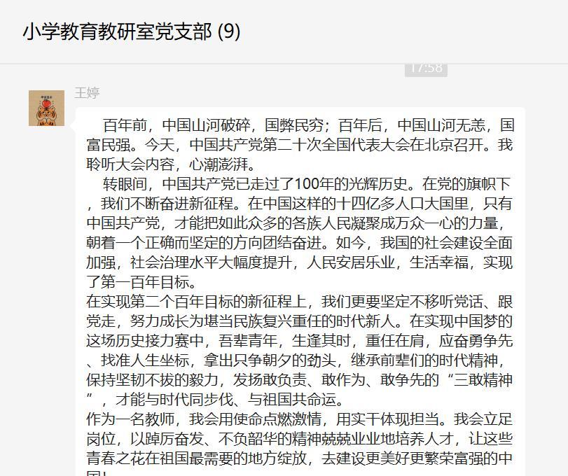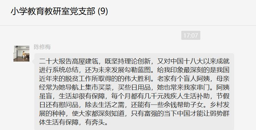 广大党员教师纷纷表示已经第一时间通过多种形式学习党的二十大精神,并将持续深入贯彻党的二十大精神。随后,每位党员教师结合自身本职工作、学习心得进行交流和讨论。(撰稿:王艳 审核:诸园)