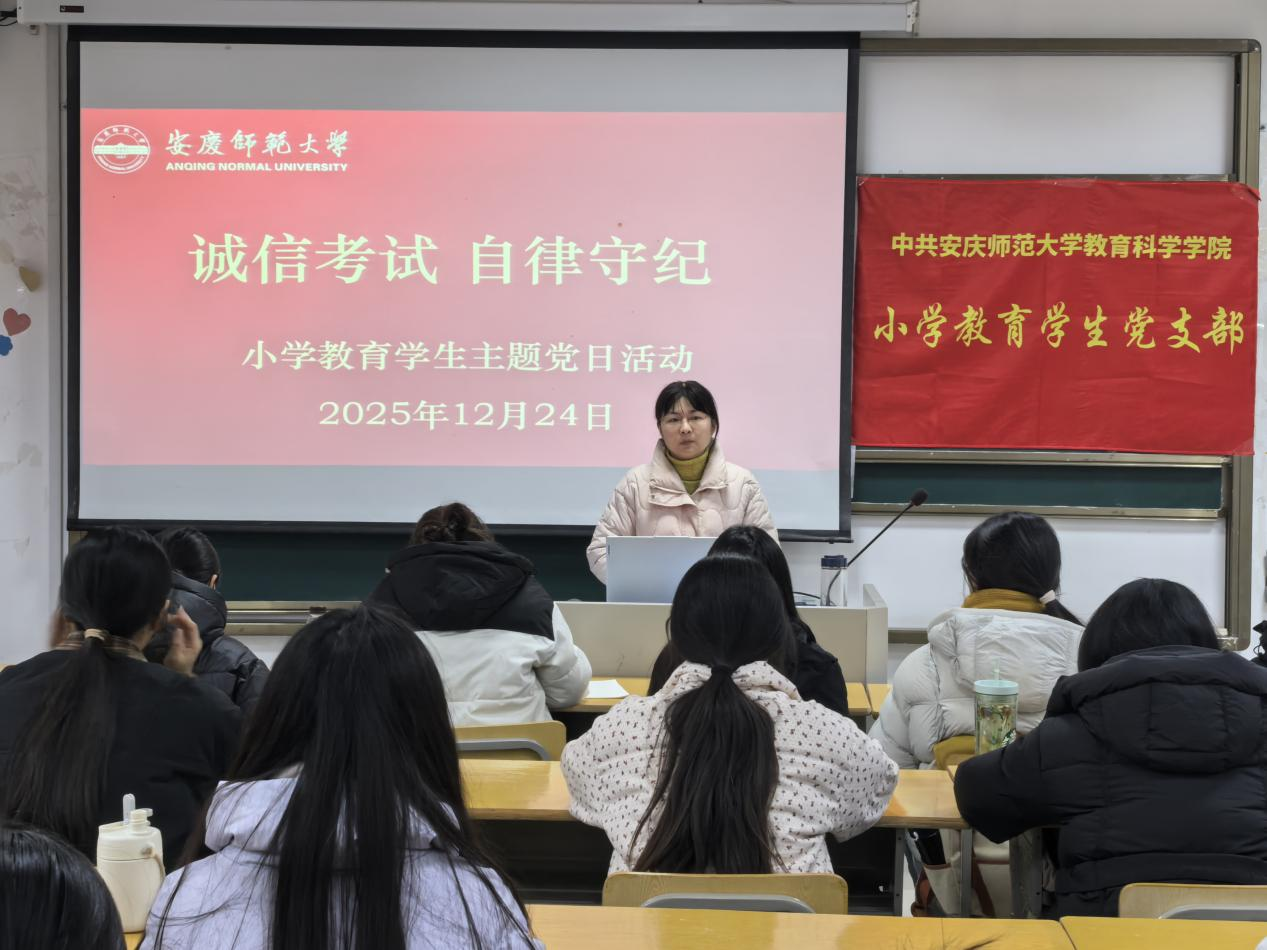 为强化学风建设、营造诚信考风,12月24日,我院小学教育学生党支部在J221教室组织开展“诚信考试,自律守纪”主题党日活动。活动由党支部书记张文君主持,全体学生党员与入党积极分子参加。