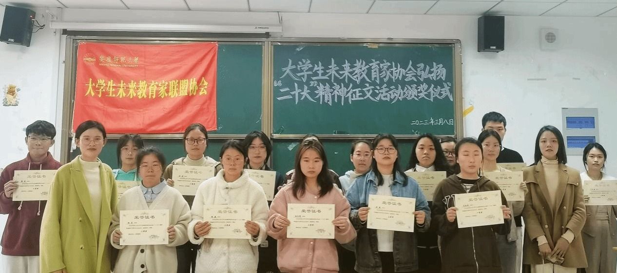 3月8日中午12时,由“大学生未来教育家协会”举办的“小小的我与大时代”主题线上征文比赛颁奖仪式在我院212教室举行,全校各院70余名学生到会观摩领奖,会议由社团指导老师姚强诚主持。