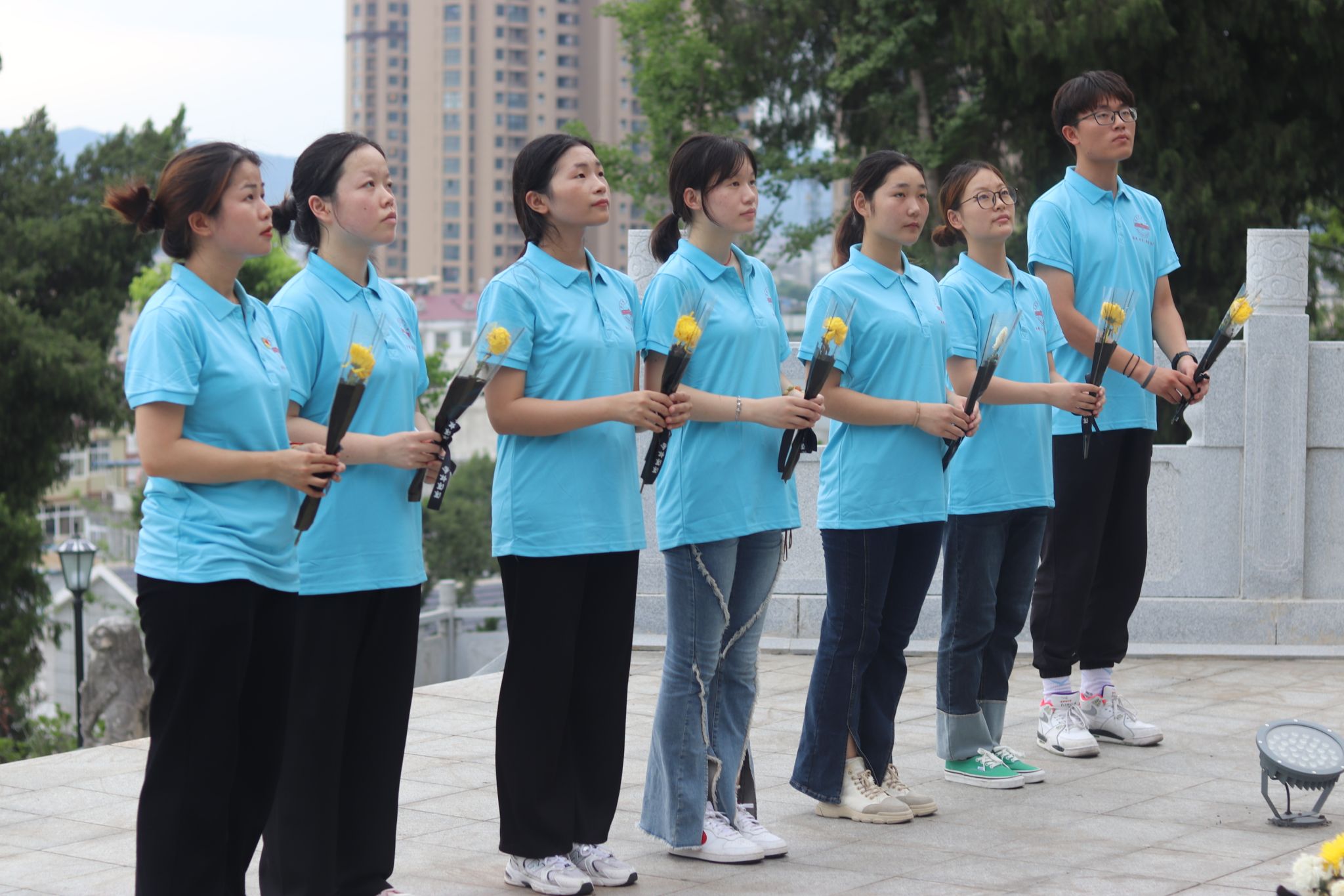 在革命烈士纪念碑前,实践团全体成员满怀崇敬之情,集体肃立默哀一分钟,以最真挚的敬意为革命烈士献上白菊,向那些为保卫国家而献出青春热血的烈士们表示深切哀悼。