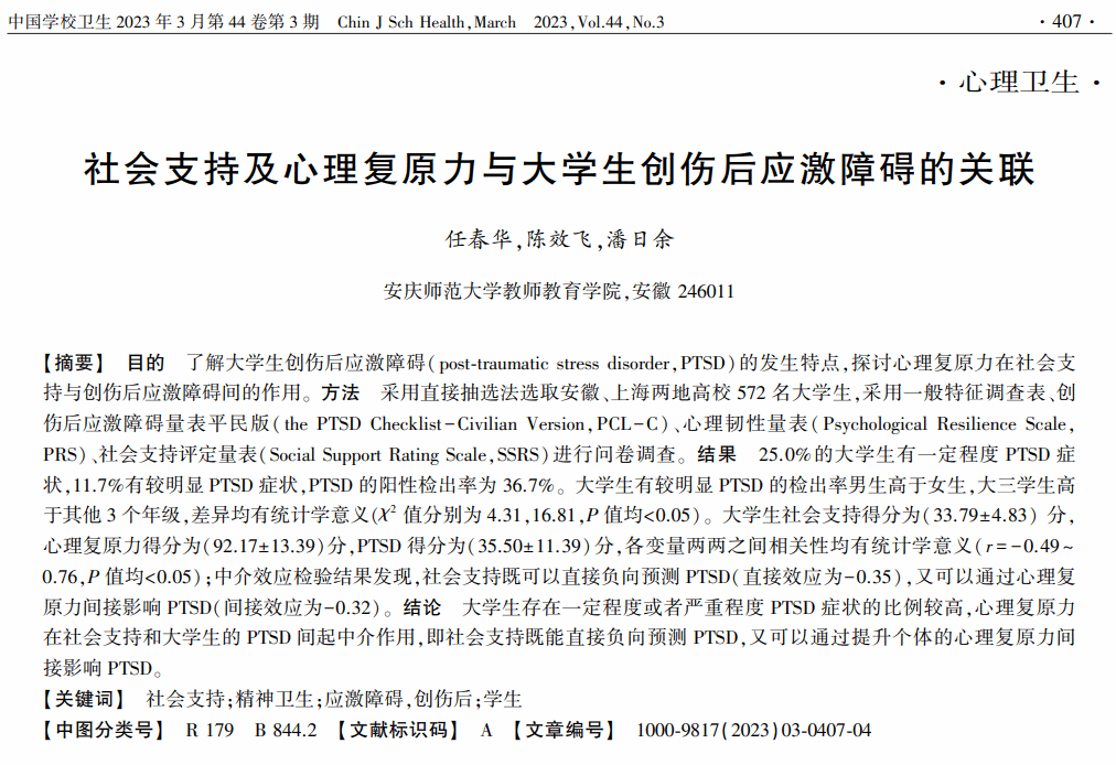 任春华,陈效飞,潘日余社会支持及心理复原力与大学生创伤后应激障碍的关联