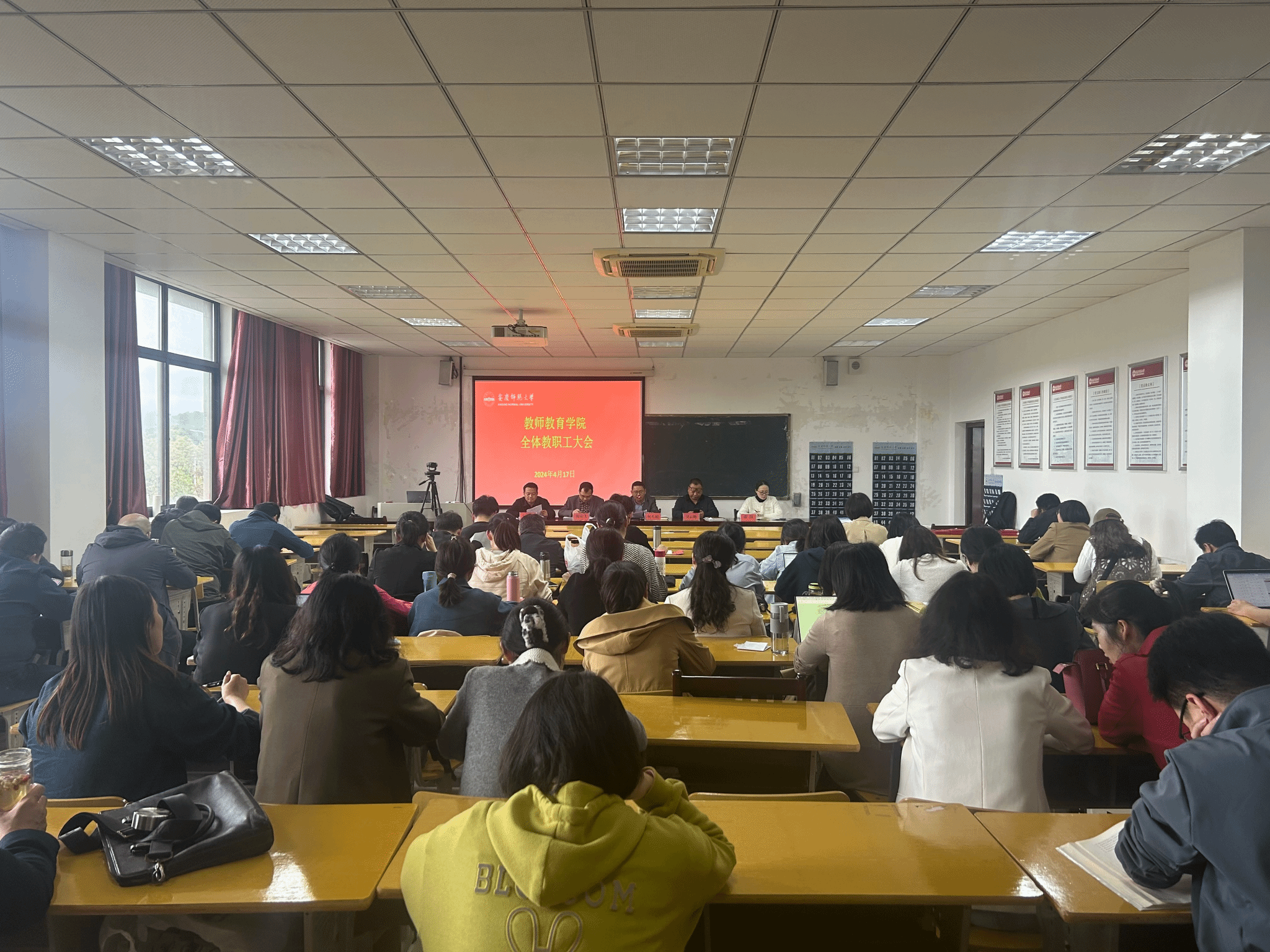 4月17日,教师教育学院在J305教室召开全体教职工大会,贯彻落实学校本科教育教学审核评估迎评动员大会精神,部署推进学院审核评估工作。会议由学院党委书记何孔蛟主持,全体教职工参加会议。